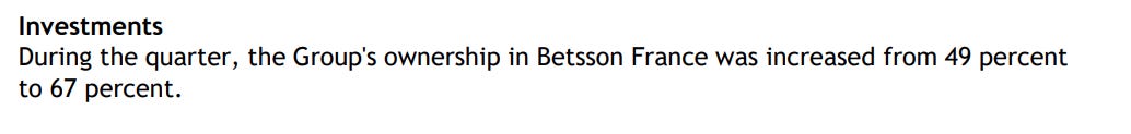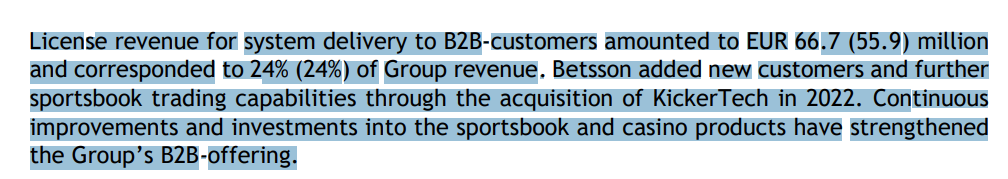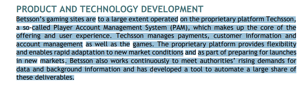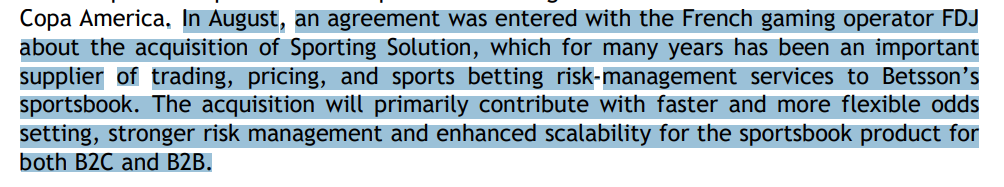 Betsson already owns their technical platform and sportsbook. They mention its a part of their strategy, I think it allows them more access to acquisitions because they can see how those companies are doing using the data from the platform.