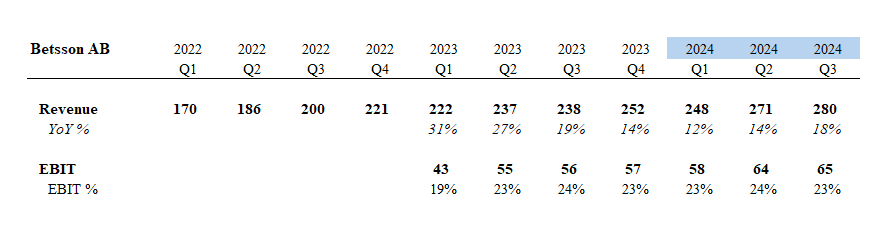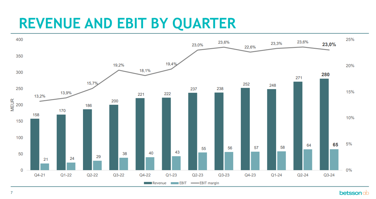 Betsson AB has grown revenue very steadily and they have managed to increase their EBIT margin to 23% which is close to industry peers.