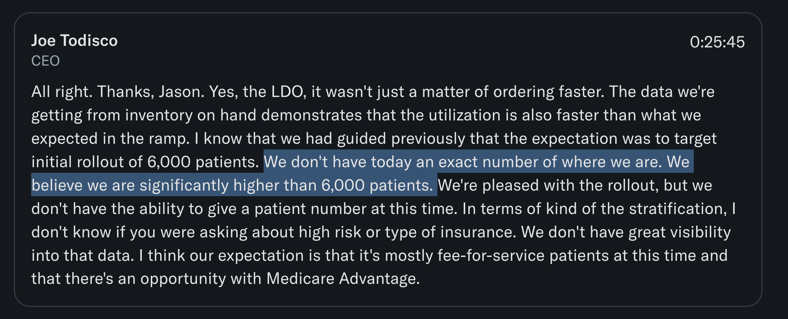 We are getting validated on our “Defencath launches well, throws off real cash, and gives them bargaining power for post-TDAPA”. LDO(Large Dialysis Organization) uptake is running ahead of expectation, and we’re already seeing strong EBITDA.