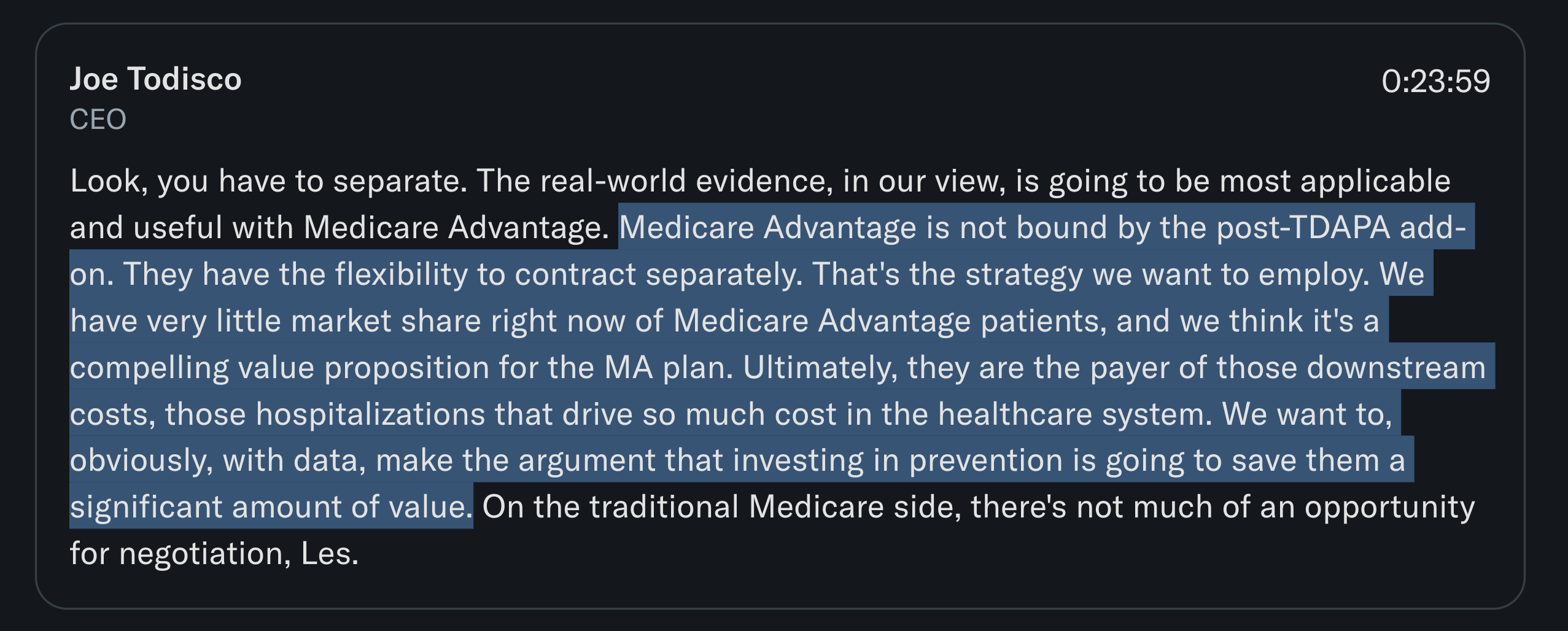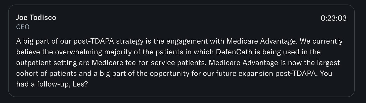 This might be confusing, but Medicare Fee-for-Service is different from Medicare Advantage. What Todisco is really saying is that Defencath today is used mostly in FFS patients, while Medicare Advantage is now the largest dialysis cohort that they’ve barely penetrated. That’s great because MA plans aren’t bound by the post-TDAPA add-on and can contract separately if the real-world data show Defencath truly cuts infections and hospitalisations.