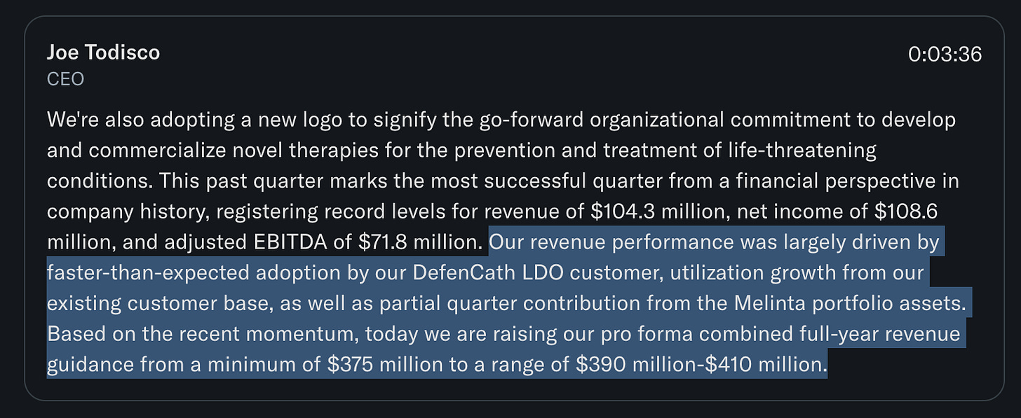 They reported $104.3m in net revenue, of which $88.8m was Defencath and about $15.5m came from one month of Melinta. Adjusted EBITDA was $72m.