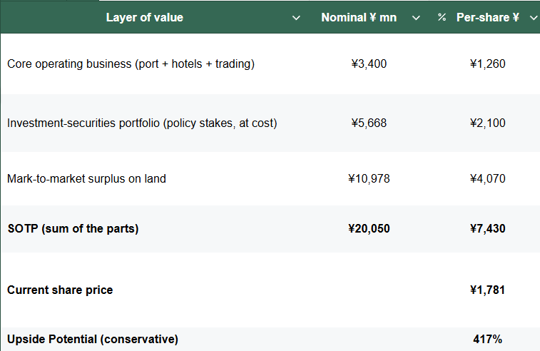Monetizable Land at ~¥7,000-¥11,000. (ultra conservative value, last appraised in 2002). (¥2,700-4,100/sh)