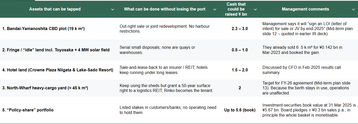 The easiest thing to monetize is their share portfolio and management has stated that they will reduce their investment portfolio every year by ¥0.3bn (They have not said exactly where the proceeds will go). The whole thing is monetizable because its a bunch of cross-holdings.
